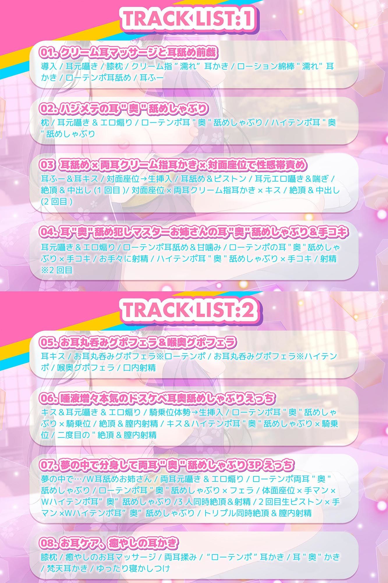 (耳ふー&耳キス/対面座位→生挿入/耳舐め&ピストン/耳元エロ囁き&喘ぎ/絶頂&中出し(1回目)/対面座位×両耳クリーム指耳かき×キス/絶頂&中出し(2回目))
